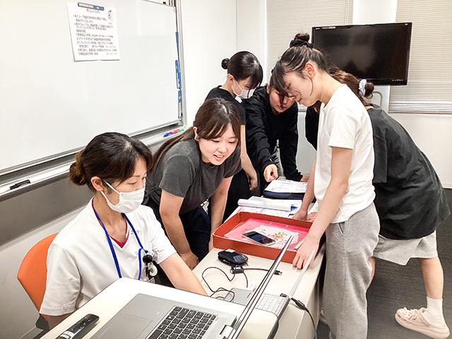 当校では、教員が看護師役・患者役を演じて、患者さんの状態観察をしている場面や先輩看護師に報告する場面などを、学生さんに見てもらう授業を展開しています。また、学生さんが模擬患者さんの状態観察をする場面もあります。その際に思考していることや解釈していることを、のちにグループで振り返りながら言葉にして、『臨床推論・臨床判断』を理解するという学習をしています。これからの学習でも、どんどん活用していってください!