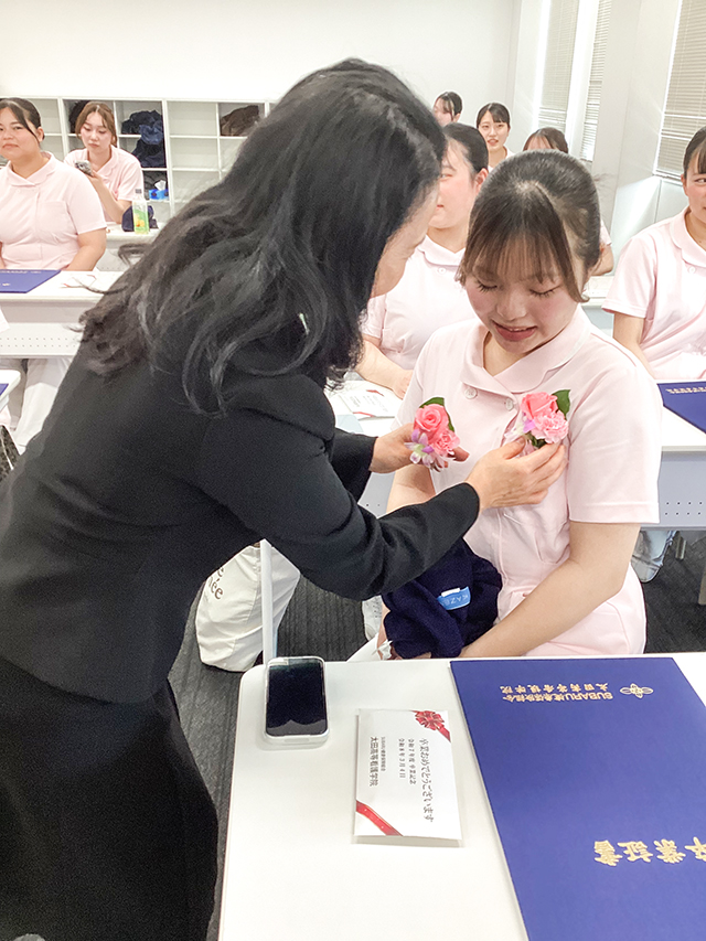 式典前には、教員から卒業生一人ひとりにコサージュがつけられ、それぞれの教員から温かいメッセージが贈られました。